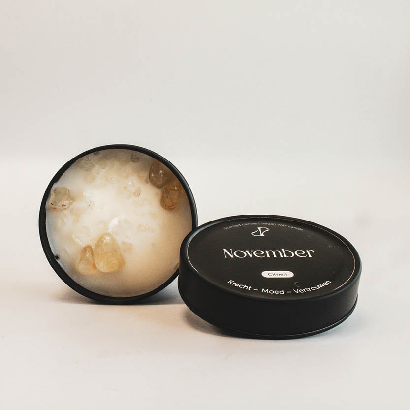 Deze maand staat in het teken van energie en optimisme. Citrien straalt als de zon en geeft je moed, zelfvertrouwen en levenslust. Een heerlijke kaars voor wie wil groeien, bloeien of gewoon wat extra licht wil toelaten.
