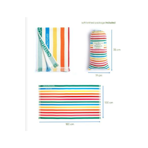 Beach towel in a bag made from plastic bottles and cotton scraps.