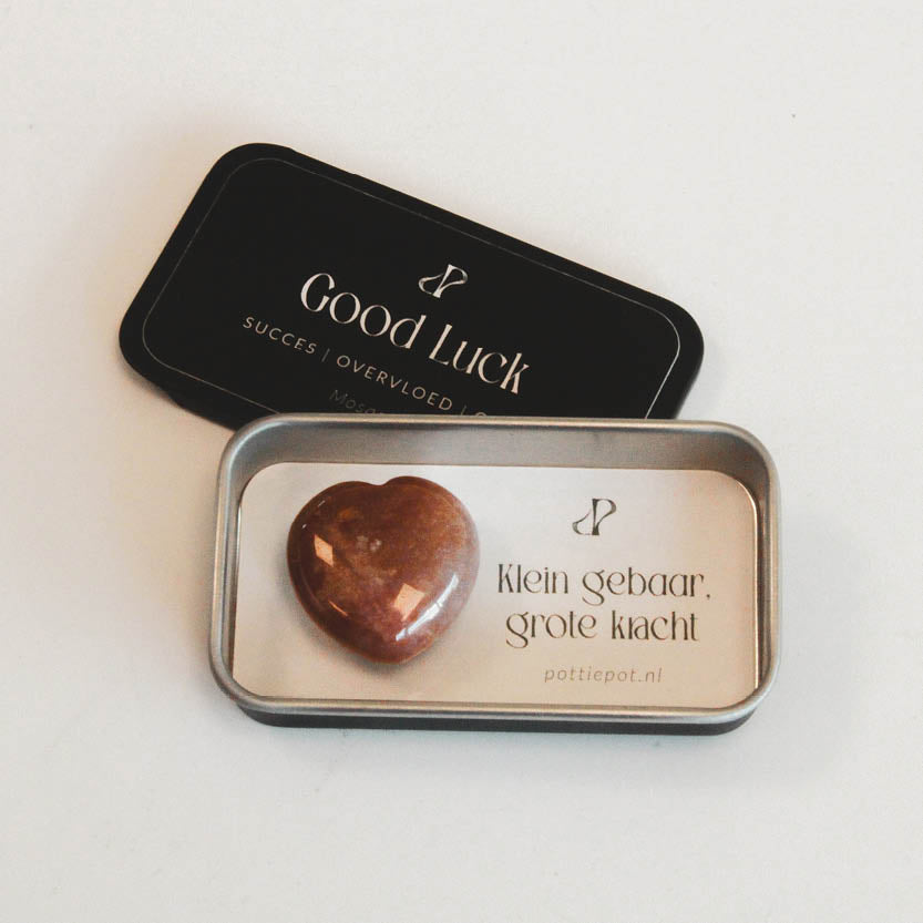 Mosagaat wordt gezien als een geluksbrenger en versterker van groei. Dit blikje is ideaal om mee te nemen bij nieuwe stappen of spannende momenten. Een klein gebaar vol positieve energie dat je helpt vertrouwen te houden in wat komt.