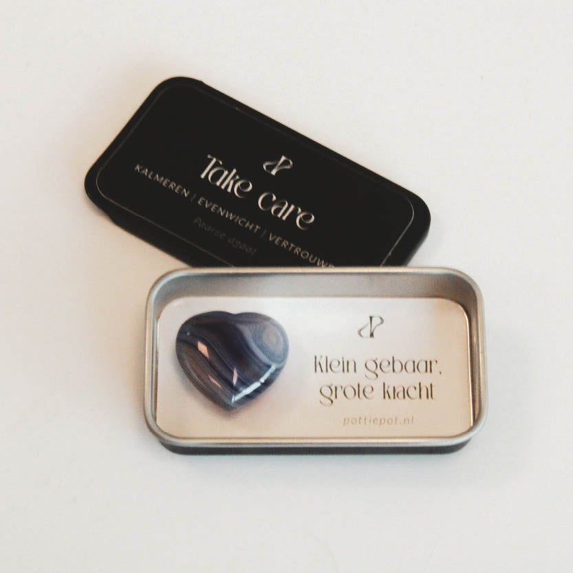 De paarse agaat in dit blikje straalt rust en balans uit. Het hartje nodigt je uit om goed voor jezelf te zorgen en momenten van stilte te nemen. Een fijn steentje om je eraan te herinneren dat zelfzorg geen luxe is, maar een basis.