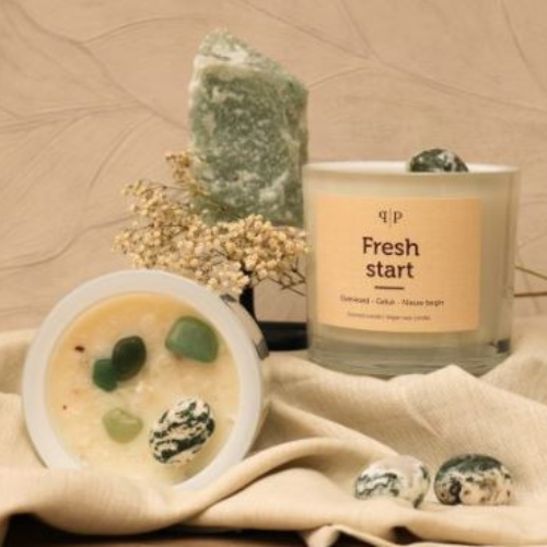 De vegan geurkaarsen van Pottie Pot zijn gevuld met de mooiste edelstenen.