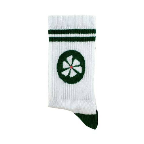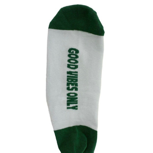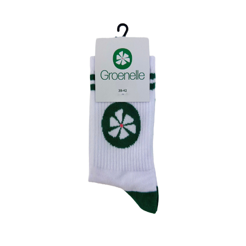 Leuke sokken in wit met donker groen. Bovenaan de sok het logo van Groenelle, onderaan de sok de tekst 'Good vibes only'
