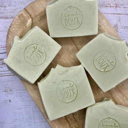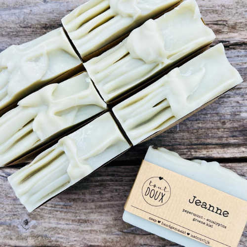 Een stuk natuurlijke zeep met pepermunt, eucalyptus en groene klei.