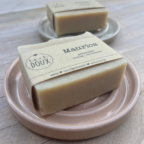 Een stuk natuurlijke zeep met geitenmelk, honing en havermout. Mag gebruikt worden vanaf de geboorte.