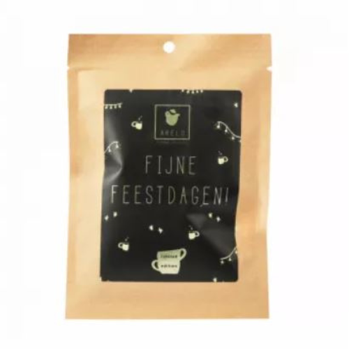 Fijne Feestdagen thee, een heerlijke zwarte thee met o.a. kruidnagel, vanille en kardemom.